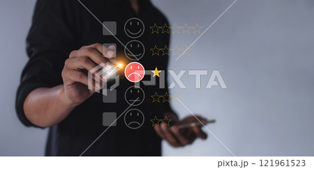 Consumer Satisfaction, Young man hand touching to review and gives 1 star, with poor service results