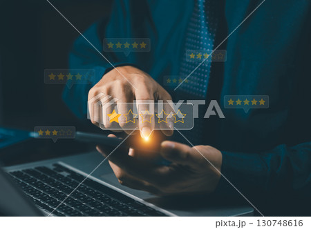 Customer Review, Young man uses smartphone mobile hand with pen touching to review and gives 1 star