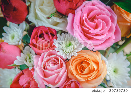 Close up shot of violet and colorful small flowers arranged in bouquet.
