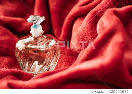 紅布背景下排列的玻璃化妝品容器和復古香水瓶