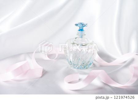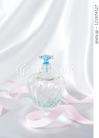 復古玻璃香水瓶,配有白色緞布和粉紅色絲帶