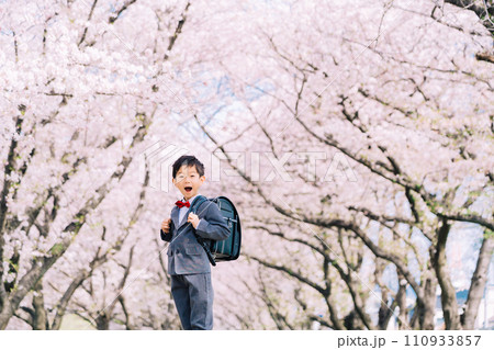 一名一年級的小學生在種滿油菜花和櫻花的公園散步