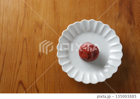 盤子上放著一顆醃梅子,背景是木紋。