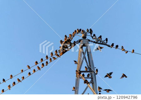 夏日黃昏,大群八哥聚集在輸電塔上 A-2 高飽和度