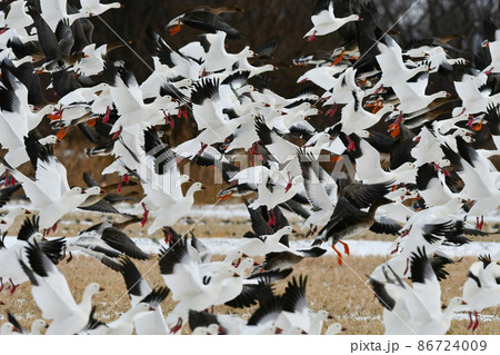 秋田縣八郎方冬季雪池中成群結隊的候鳥,大雁同伴大白額雁和豆雁。