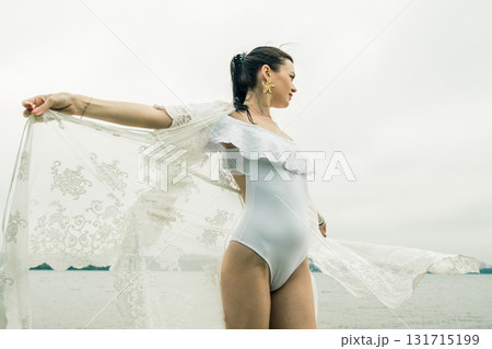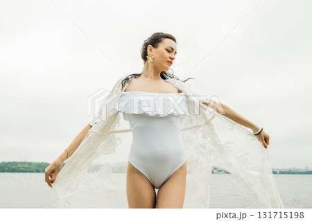 A young woman stands by the lake shore in a white swimsuit