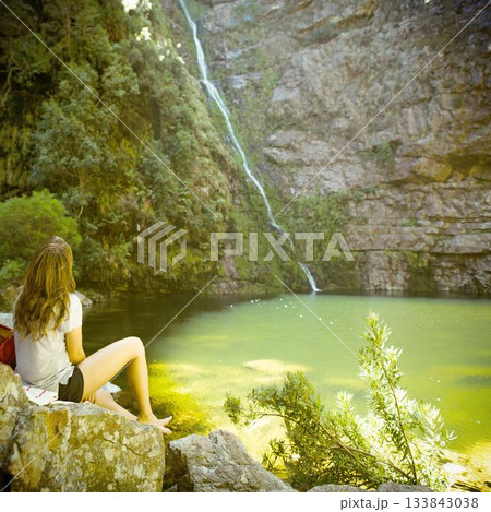 Woman sitting on rock by lake at mountains