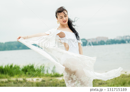 A beautiful woman in a light swimsuit with a light pareo is standing on the beach near the water