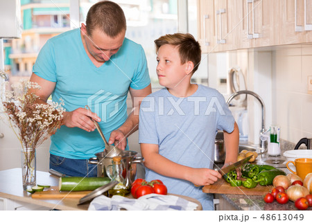 Mature couple preparing healthy vegetarian lunch at home kitchen