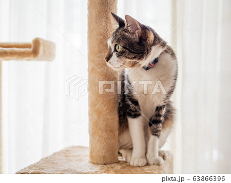 一隻貓在貓塔頂上休息,棕色虎斑和白色