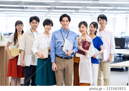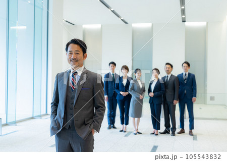 七個穿著西裝微笑的男女的全身插圖