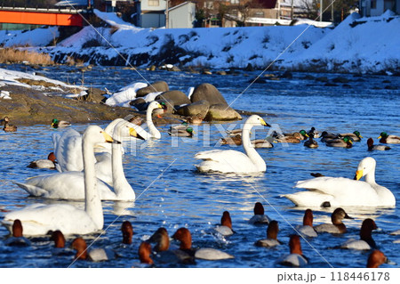 天鵝在雪中展翅飛翔(三條市五十嵐川)