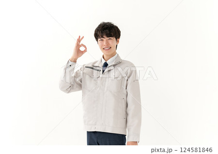 穿著工作服的年輕人,握拳