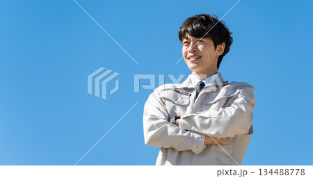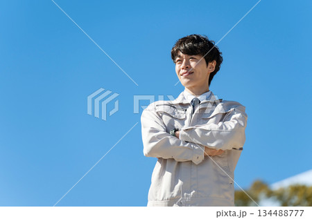 穿著工作服的年輕人,藍天