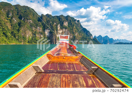 Wooden Thai traditional long-tail boat on a lake with mountains at Ratchaprapha Dam or Khao Sok National Park, Thailand