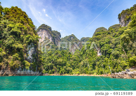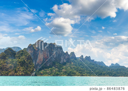 Lake with mountains at Ratchaprapha Dam or Khao Sok National Park, Surat Thailand