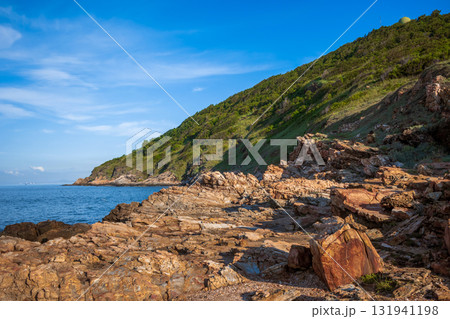 Dramatic coastal cliff view at Khao Laem Ya in Rayong, Thailand, showcasing rugged red rocks, and the vast blue ocean under a bright sky
