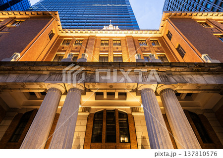 Low-angle view of the Mitsubishi UFJ Trust and Banking Museum, situated in the Marunouchi business and financial district, Chiyoda, Tokyo, Japan.