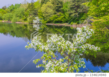 青森縣鶴田町富士見湖公園的森林春景