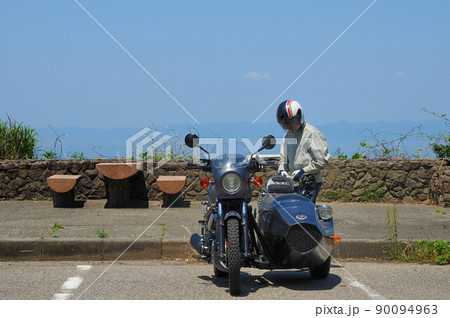 站在海邊停車場的黑色邊車