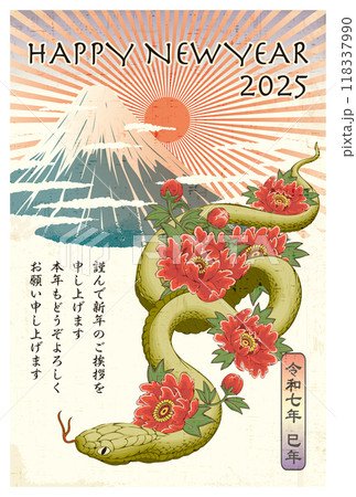 2025 年新年賀卡模板「Hanahebi 和富士」新年快樂圖案帶註釋