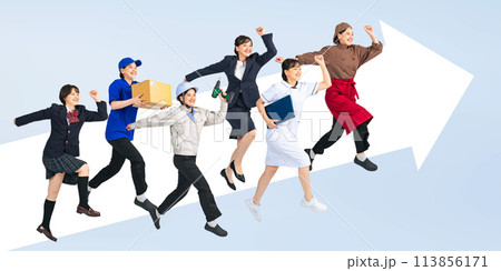同一個女人打扮成各種職業跳躍的複合圖像