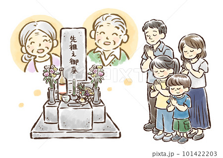 手繪插畫一家四口在祖先盂蘭盆墓前雙手合十,上墳