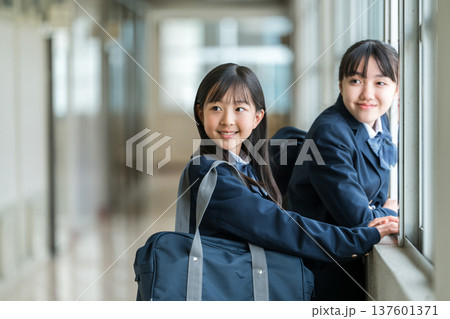 國中生、高中生、女高中生面帶笑容地走過教學大樓(上學、回家、上下學)