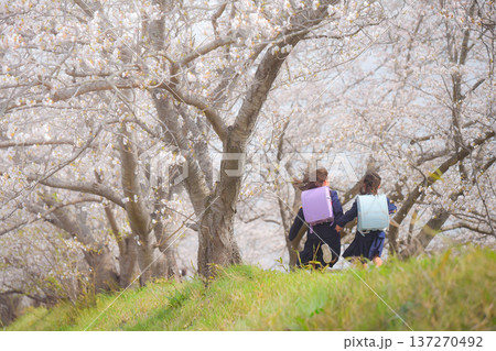 插圖描繪了兩個小學生手牽手,是好朋友,正在上下學途中。