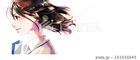一個穿著毛衣、有文件、頭髮上別針、沒有背景、右邊空間的女孩的側面圖