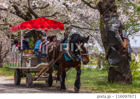 日本賞櫻百選之一的岩手縣北上展示區的觀光馬車