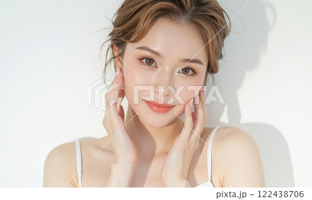 Illustration of a close-up photo of a beautiful young woman's face with good skin posing as a model selling skin care cosmetics. Can be used as an idea for models to pose for advertising shoots.