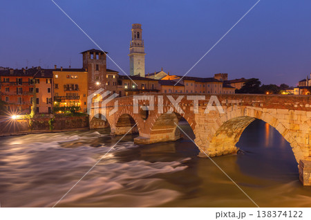 Ponte Pietra over Adige River at night in Verona, Italy