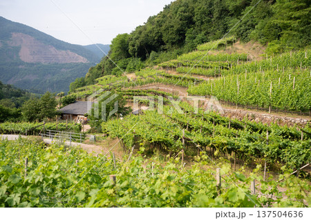 Vineyards cascade down hillsides in Cembra Valley, Trentino, for wine production