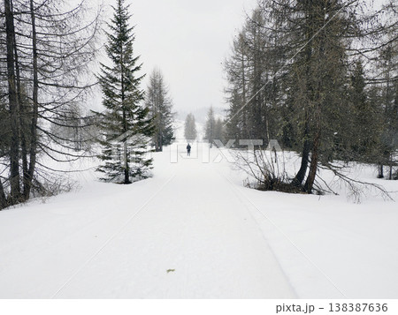 Trekking in the dolomites mountains under a heavy snow in winter