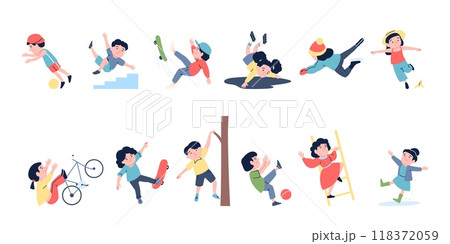 Kids fall down. Children falling from tree ladder staircase, slip and stumble. Dangerous outdoor accidents, at school or kindergarten, recent vector scenes