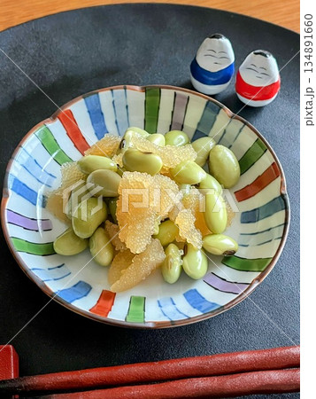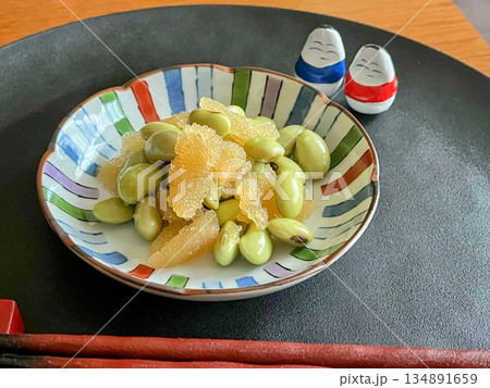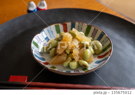 一小碗會津當地特色菜「豆角」和一個玻璃杯娃娃