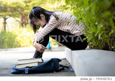Depressed asian child girl student failed important test,female student sit hugs her knees up to the chest and crying alone,sad schoolgirl feel stressed,disappointed with her exam at primary school