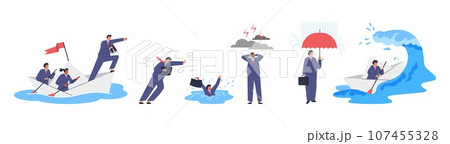 Businessman lead business in financial crisis, risk management, success wrong strategy in storm vector illustrations set