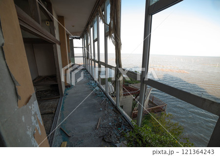 海岸邊一間廢棄旅館的公共浴室廢墟
