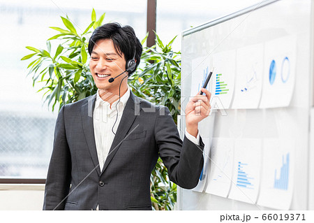 一位身穿西裝、沒打領帶的年輕男子用指針指向的插圖