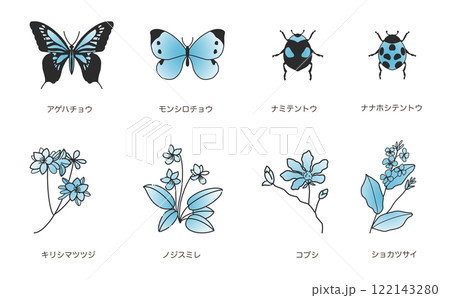 春天的花朵和昆蟲線描集顏色