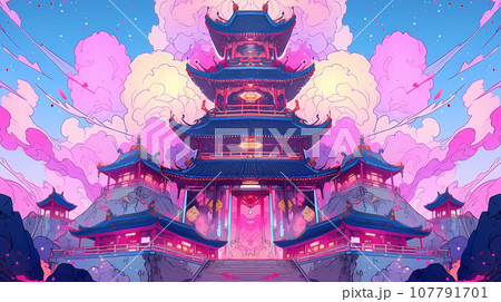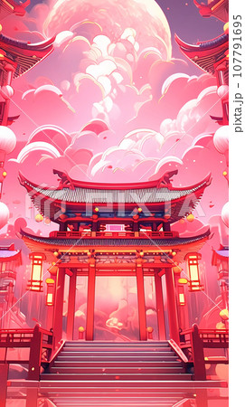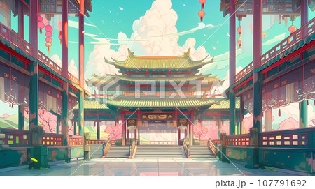 手绘卡通动漫中国风节日氛围街道建筑背景插画