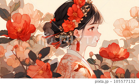 手绘卡通唯美的花丛中的东方女人插画