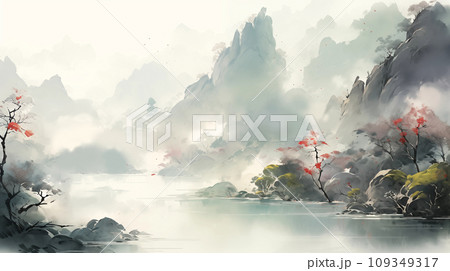 手绘唯美的水墨山脉风景插画