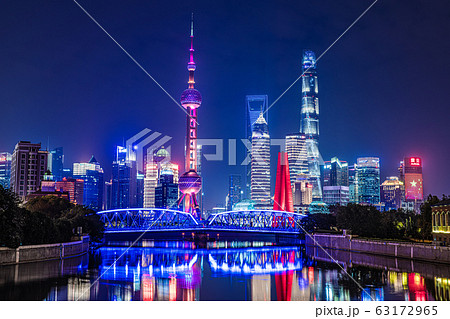 Cityscape view of Shanghai city at night. Skyscraper of Lujiazui in Pudong, view from The Bund of Shanghai, China. landmark and popular for tourism attractions. Travel and Vacation concept