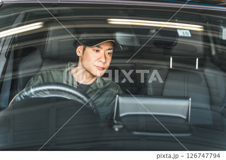 一名男性汽車修理工正在檢查汽車內部
