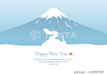 蛇年新年賀卡模板:富士山和雪中的蛇