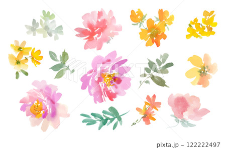 抽象粉紅色牡丹和水彩黃色花朵的向量插圖集