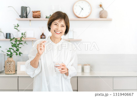 老年婦女在廚房刷牙(牙齒護理、口臭護理)